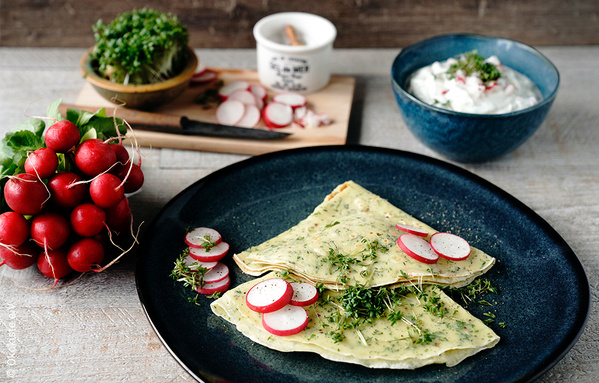 Pfannkuchen, Eierkuchen, Crêpes, Palatschinken, Pancakes…Ein Gericht mit vielen Namen und regionalen Unterschieden in der Rezeptur. Ob süß mit Früchten und Honig oder herzhaft mit Käse. Pfannkuchen werden fast überall gern gegessen. Sie sind schnell zubereitet und für die Herstellung werden nur weniger Zutaten benötigt. Wir empfehlen Ihnen in dieser Woche eine farbenfrohe Variante mit Radieschen und Kresse.