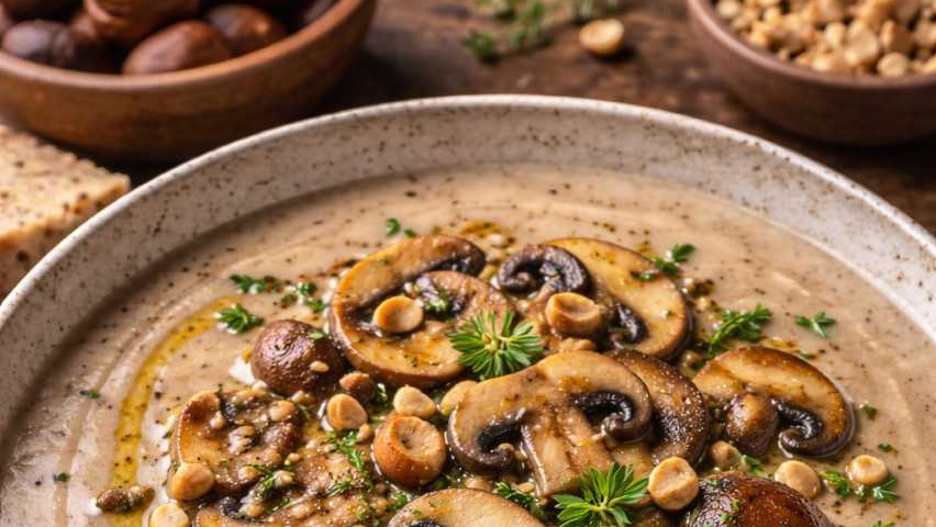 Maronen kurz grob hacken, mit in die Gemüsebrühe geben und für 10 Minuten köcheln lassen. Sahne zur Gemüsebrühe dazu geben, Stabmixer vorbereiten und die Suppe fein cremig pürieren. Jetzt die Pilze und Haselnüsse mit in die Suppe geben, vermengen, abschmecken und heiß servieren.