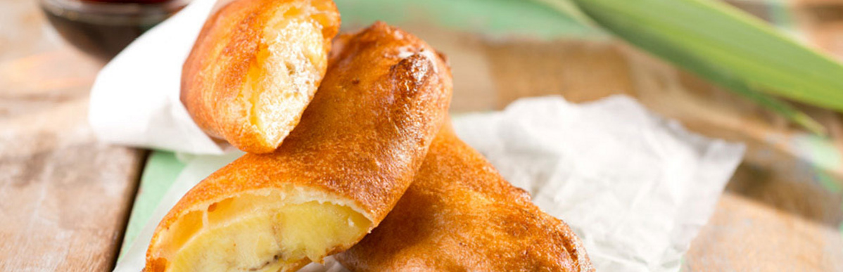 Die Bananenhälften durch den Teig ziehen und bei 180 °C frittieren bis der Teig goldbraun ist.
