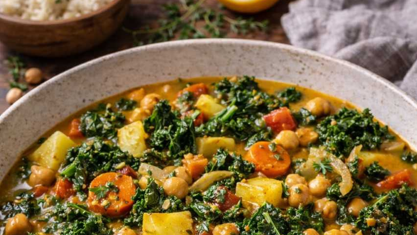 Kartoffeln schälen, Möhren, Tomaten und Grünkohl putzen und kleinschneiden. Kichererbsen abtropfen lassen.