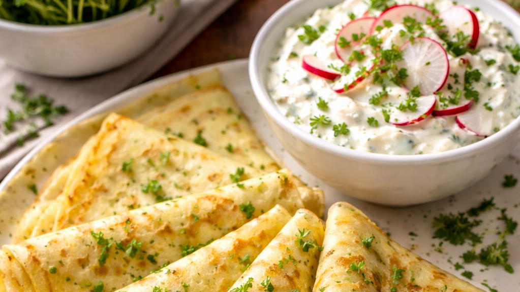 Die Pfannkuchen mit den Radieschenscheiben und der Kresse garnieren und zusammen mit dem Dip servieren.