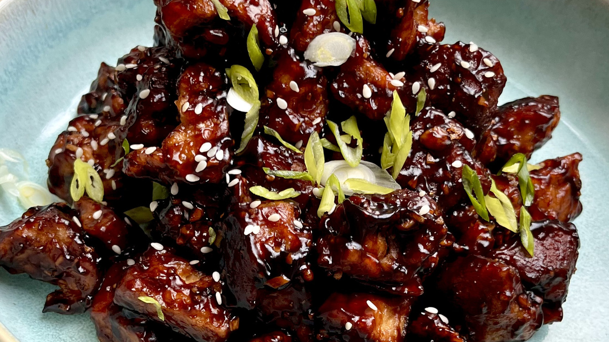 Zuerst wird der Tofu in grobe Stücke zerrissen, um eine Struktur entstehen zu lassen. Danach wird der Tofu mit 2 EL Speisestärke gut vermengt, sodass an allen Stellen die Stärke hängen bleibt. Eine Pfanne mit Öl erhitzen und die panierten Tofustückchen scharf anbraten.