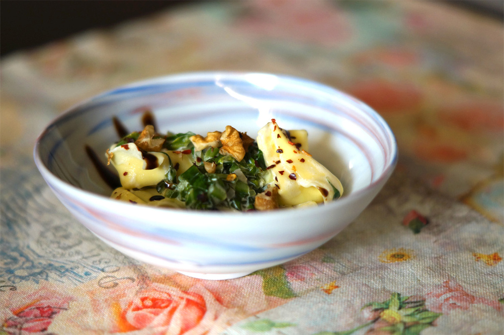 In das kochende Wasser etwas Salz geben, ausschalten und die Tortelloni für 4 Minuten ziehen lassen, danach in der Pfanne mit der Soße durchschwenken. Walnusskerne hacken, darüber streuen und genießen.